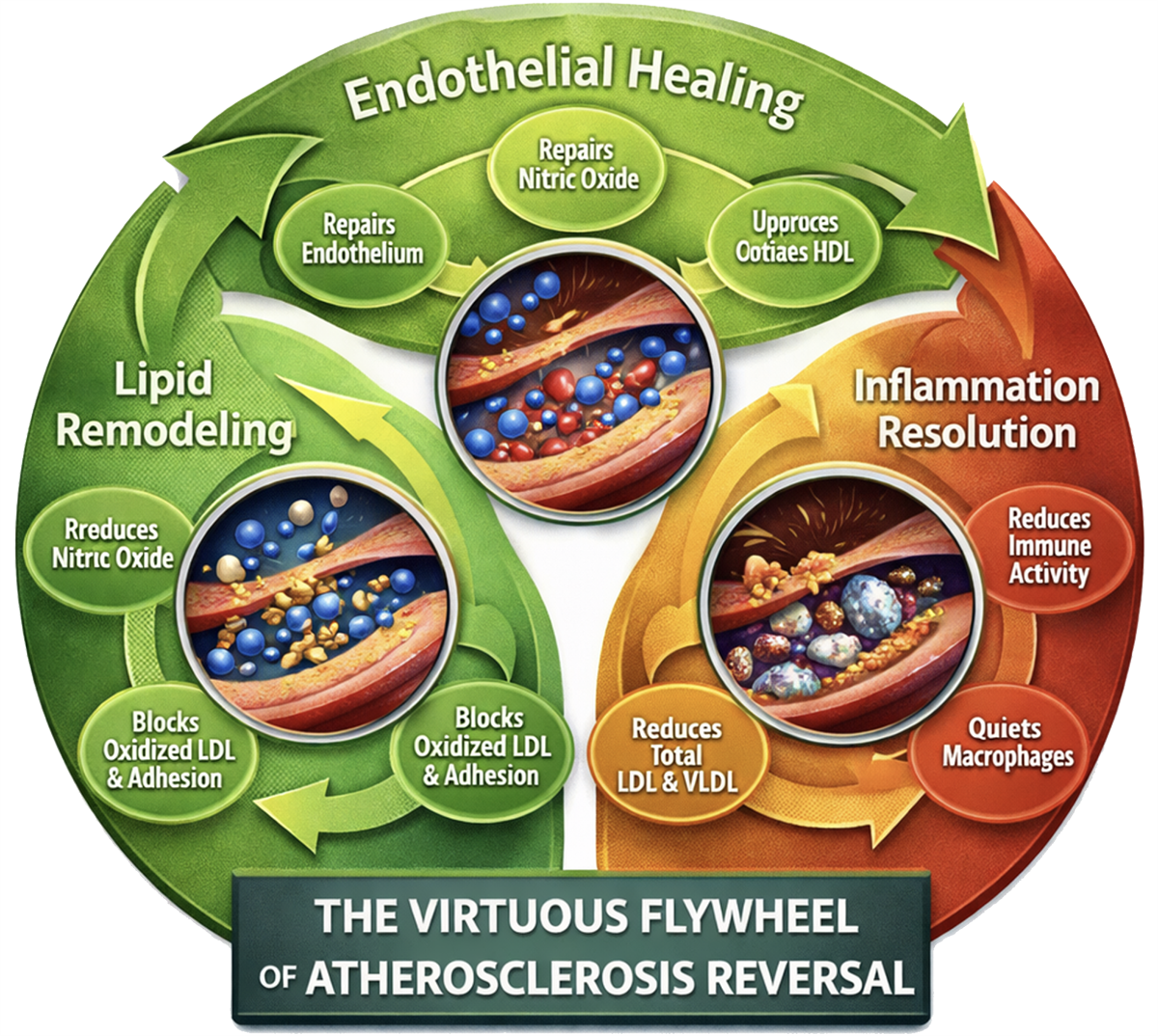 Figure 1. The Virtuous Flywheel of Atherosclerosis Reversal, running clockwise from Endothelial Healing through Lipid Remodeling to Inflammation Resolution. Each master node contains its own three-part sub-cycle.
