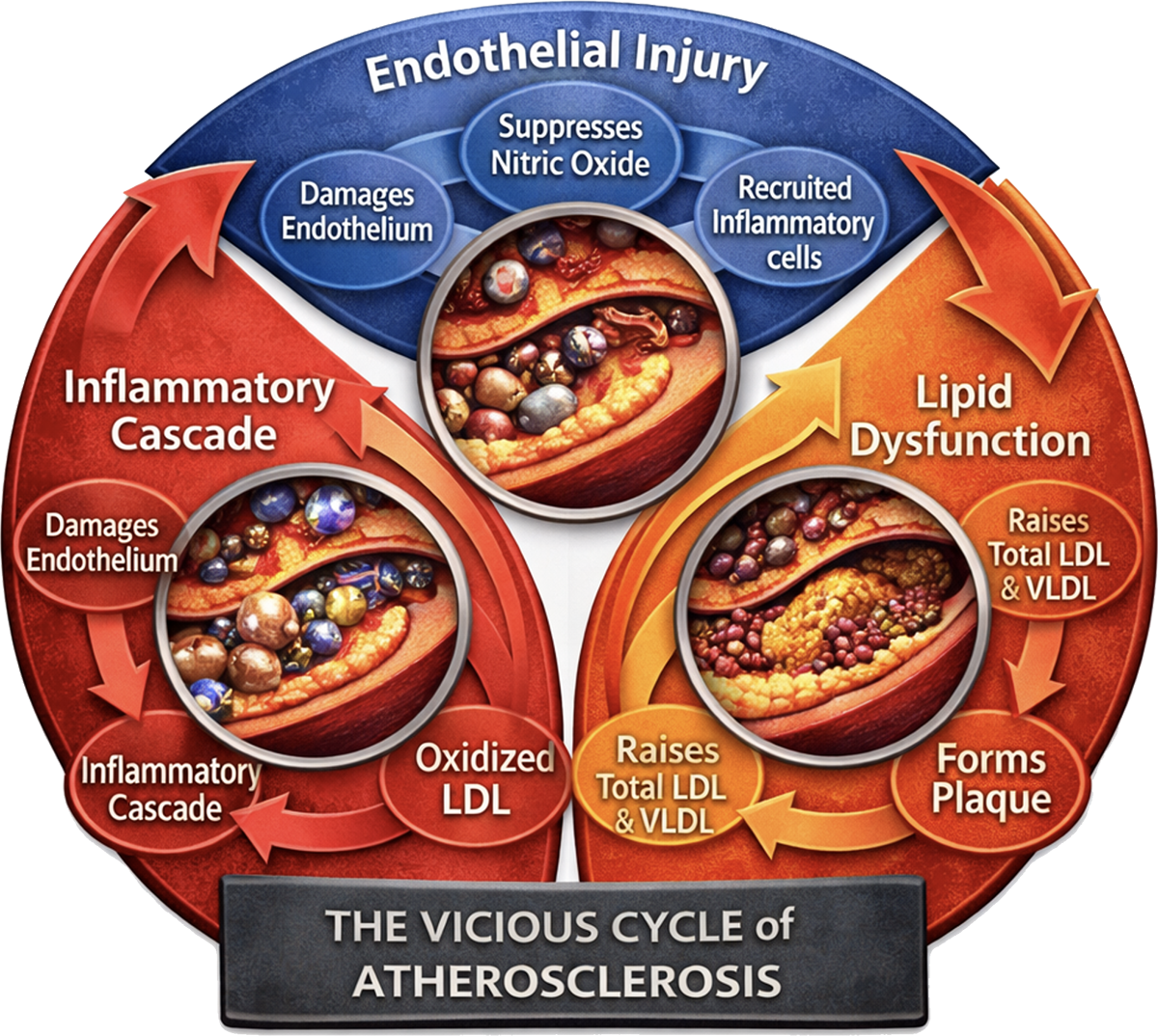 This flywheel runs on three pillars, each driving the next. Endothelial damage is where it begins: