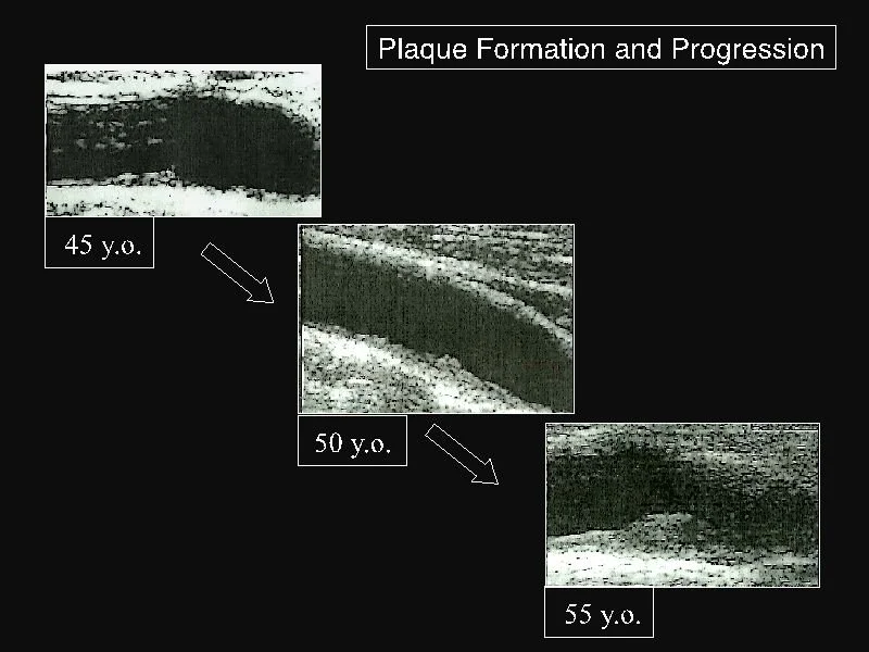 Here is a picture of how a plaque in the carotid artery in the neck builds up over ten years, from age 45 to 55. A seemingly healthy person. Normal lipids: Cholesterol 165 mg/dL, HDL 71, Triglycerides 64. Normal blood pressure. No symptoms. At 45 years old, he had a small plaque, 1.3 mm. Ten years later, at age 55, he had a type 5 plaque, a thin-cap fibrous plaque indicating a high risk of plaque rupture, that could result in an embolic stroke. His risk of a heart attack due to similar plaque in the heart would be high as well. All of a sudden.
