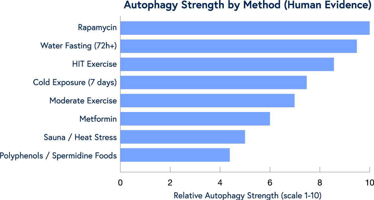 Long fasts of 48-72 hours can amplify autophagy by 8-10x, initiating stem-cell regeneration and immune renewal.